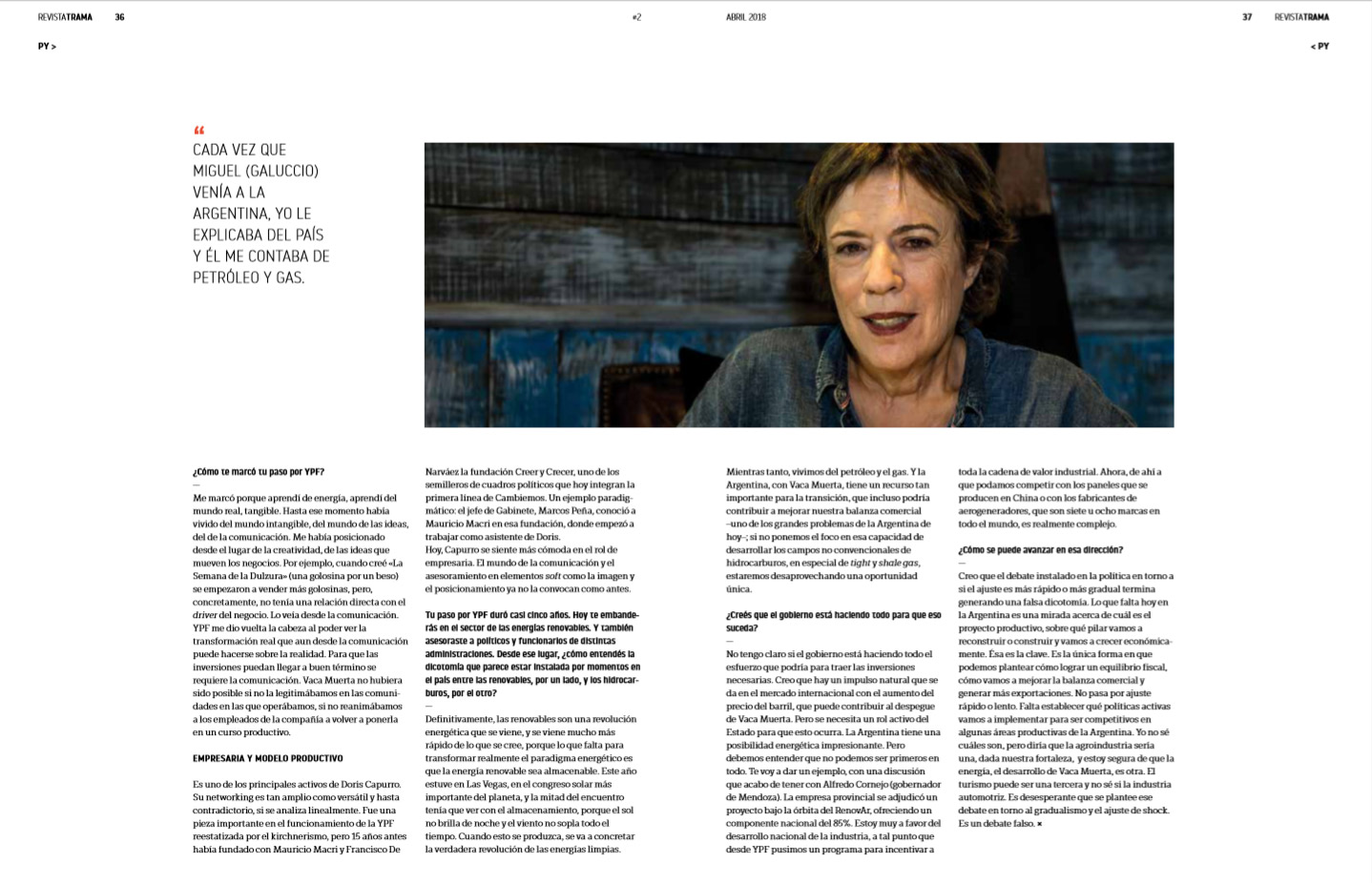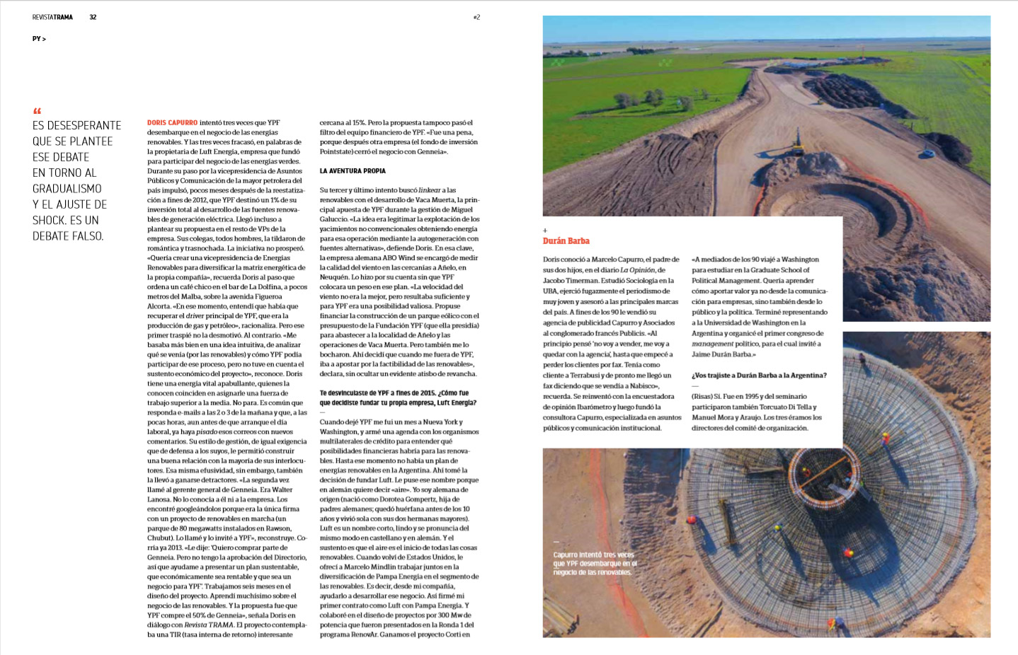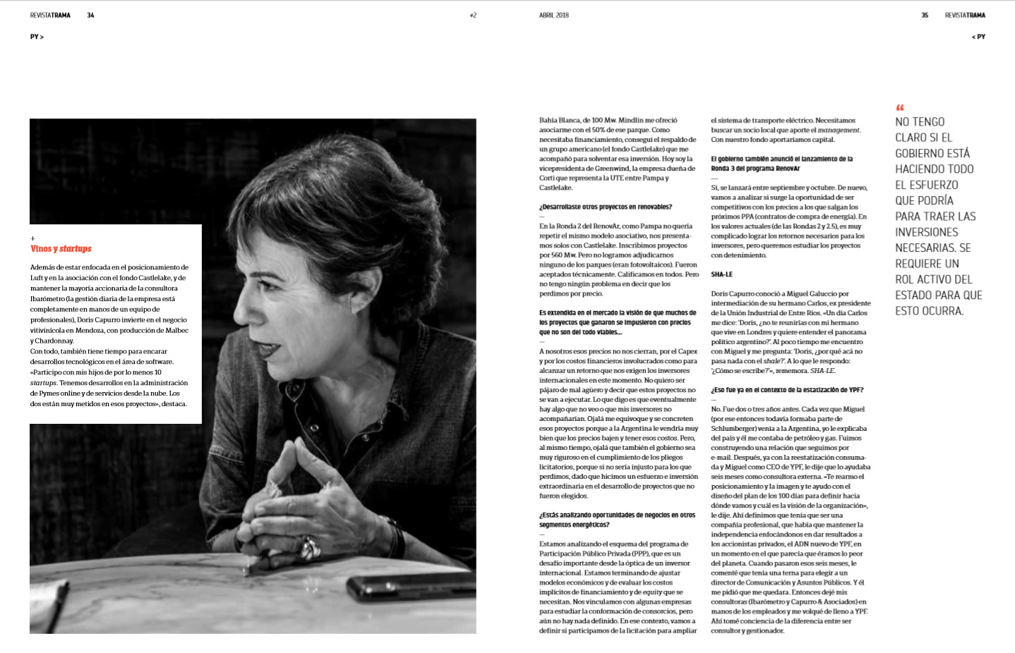DORIS CAPURRO intentó tres veces que YPF desembarque en el negocio de las energías renovables. Y las tres veces fracasó, en palabras de la propietaria de Luft Energía, empresa que fundó para participar del negocio de las energías verdes. Durante su paso por la vicepresidencia de Asuntos Públicos y Comunicación de la mayor petrolera del país impulsó, pocos meses después de la reestatización a fines de 2012, que YPF destinó un 1% de su inversión total al desarrollo de las fuentes renovables de generación eléctrica. Llegó incluso a plantear su propuesta en el resto de VPs de la empresa. Sus colegas, todos hombres, la tildaron de romántica y trasnochada. La iniciativa no prosperó.